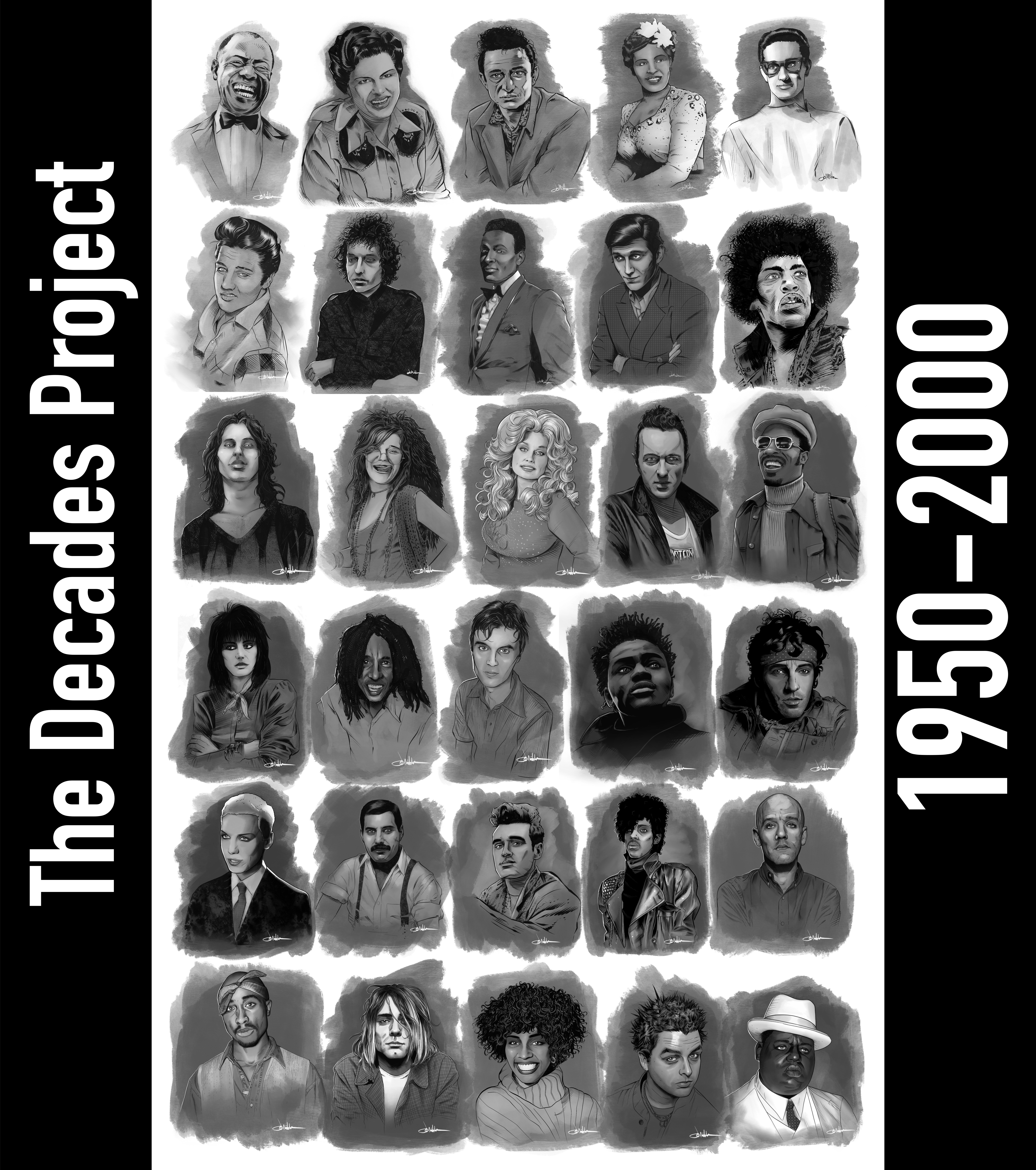Took a bit of time, but I’m finally finished with my “Decades Project”. It was fun, but I’m not happy with a few of these (Bob Dylan, I’m looking at you). It’s hard for me to go back when I finish a piece, so this might be the final product.